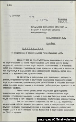 Председатель Комитета госбезопасности Украинской ССР Р. Муха написал информационное сообщение ЦК Компартии Украины. Он сообщает о последствиях аварии на реакторе первого энергоблока ЧАЭС 14 сентября 1982 года, в результате которой произошло "выпадение радиоактивного топлива в графитовую кладку".