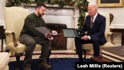 Зеленский передал Байдену медаль (по данным Радио Свобода, это "Крест боевых заслуг" от одного из украинских военных, с которыми президент накануне встречался в Бахмуте: именно в этом городе в Донецкой области сейчас идут самые опасные бои с Россией.