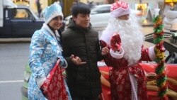 Рядом с дедом – Снегурочка. Водители проезжающих мимо машин сигналят, а на светофоре водитель троллейбуса не обращает внимания на переключившийся зеленый сигнал и, как завороженный, достает мобильный телефон – снимает удивительный транспорт.