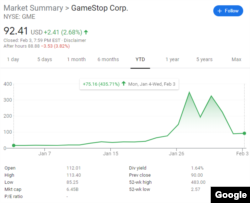 Речь идет о спекулятивном росте акций компании GameStop Corp. – это сеть магазинов по продаже видеоигр, приставок и сопутствующих товаров. За январь акции GameStop взлетели в цене с $17 до 325, хотя еще год назад одну акцию можно было купить за $4. Из-за взрывного спроса на акции компании инвестиционные фонды теряют миллиарды долларов.