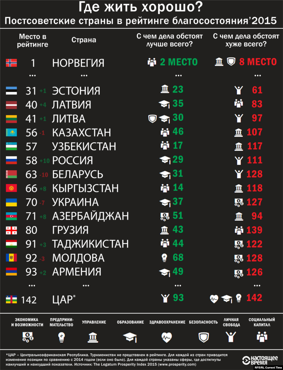 Занявшая первое место в рейтинге Норвегия и занявшая последнее место ЦАР (Центральноафриканская Республика) добавлены для сравнения. Туркменистан не представлен в рейтинге. Для каждой из стран приводится изменение позиции по сравнению с 2014 годом (если оно было). Для каждой страны указаны сферы, где достигнуты наилучший и наихудший показатели. Источник: The Legatum Prosperity Index 2015 (www.prosperity.com)